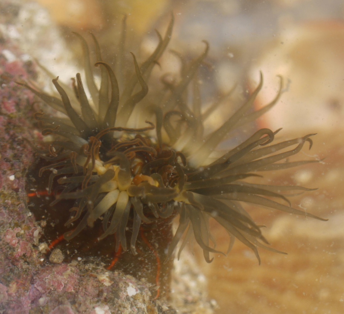 Three anemones have columns that are slenderer than in Diadumene lineata and stripeless, though the outer edges of internal partitions often show through the columns and look like white vertical stripes on the columns. Diadumene leucolenais an exotic species that has been recorded in bays and harbors from Newport Bay to Coos Bay, including San Francisco Bay. Its column is usually pale pink, salmon or white, though sometimes it is faintly greenish near the top. In the other two species the extended column is at least twice as tall as it is wide, usually only up to 0.5 cm in diameter, and translucent orange or yellow. Diadumene cf. cinctais an exotic inhabitant of bays and estuaries including San Francisco Bay, and its column is without bulges or kinks. Diadumene lighti is found on the outer coast, typically in sand among the holdfasts of seaweeds; its column usually has bulges or kinks and contracts asymmetrically.